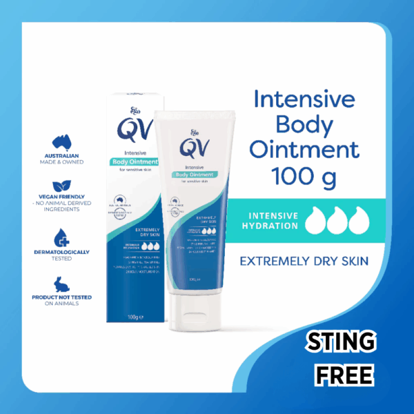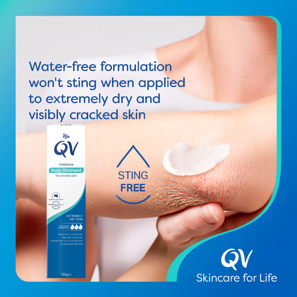 QV Intensive Body Ointment is a highly emollient ointment that has been formulated to care for extremely dry or visibly cracked skin. Suitable for eczema-prone skin. This water-free moisturising ointment helps to seal moisture into the skin without stinging.